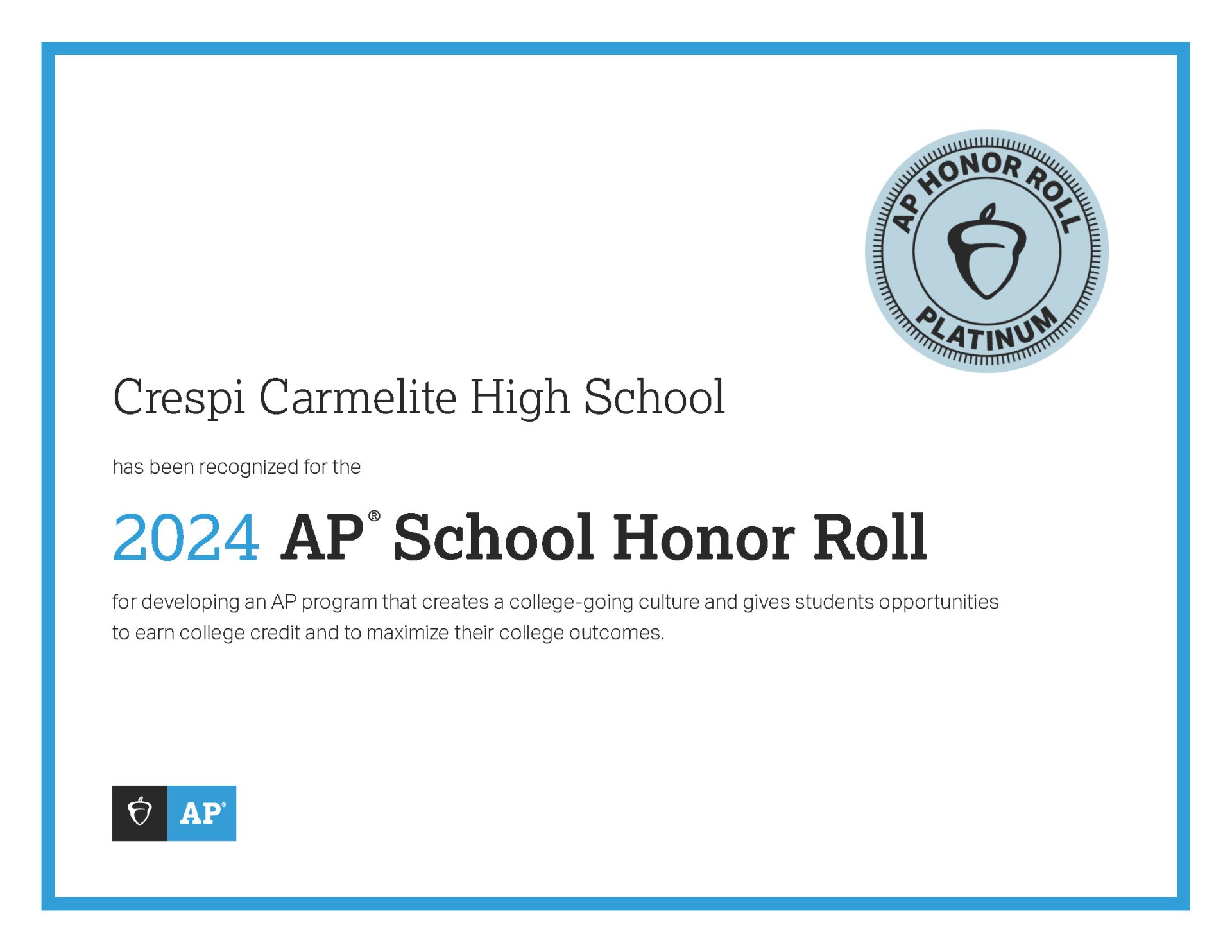 Congratulations to Crespi Carmelite High School who was named to the 2024 AP School Honor Roll! The AP School Honor Roll recognizes schools whose AP programs deliver results and broaden student access.